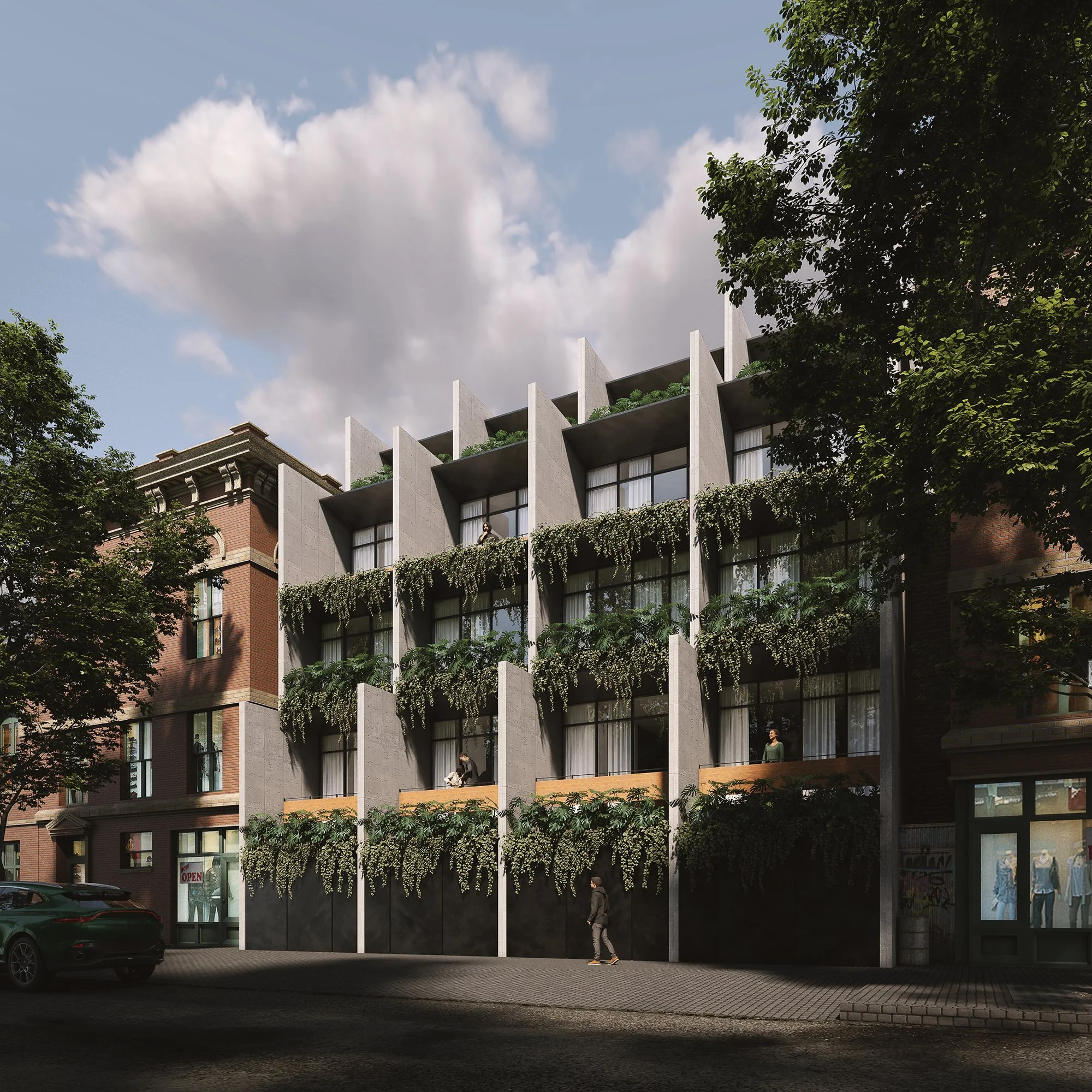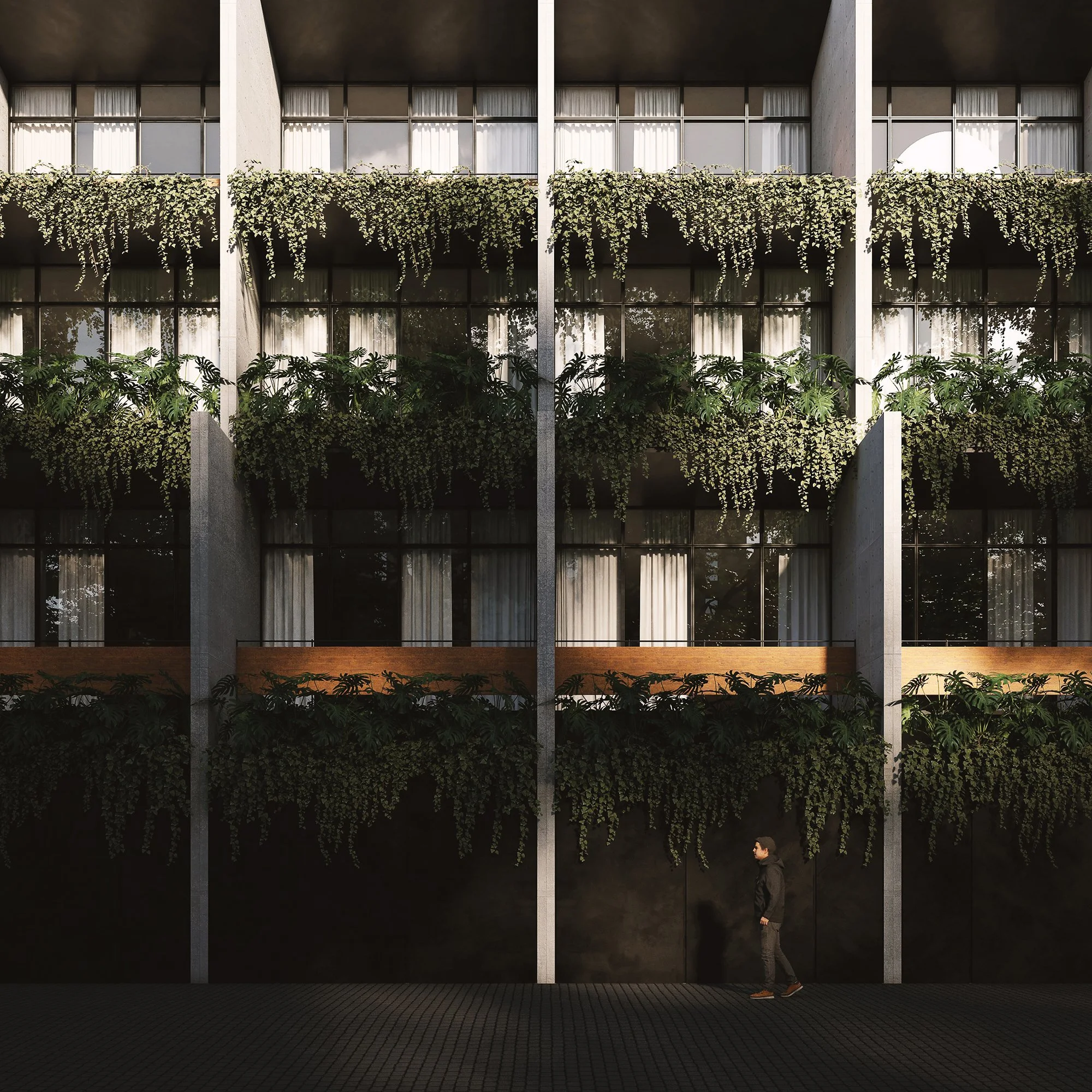 El proyecto surge de la necesidad de desarrollar vivienda residencial, aprovechando su ubicación para explorar nuevas formas de habitar. La propuesta se organiza en cuatro volúmenes que albergan “hábitats” verticales independientes, alejándose del concepto tradicional de departamento. La circulación se concentra para optimizar el espacio, mientras que los servicios se ubican al centro y las áreas habitables en los extremos, favoreciendo iluminación, ventilación y flexibilidad, dando como resultado un conjunto sobrio y contemporáneo.