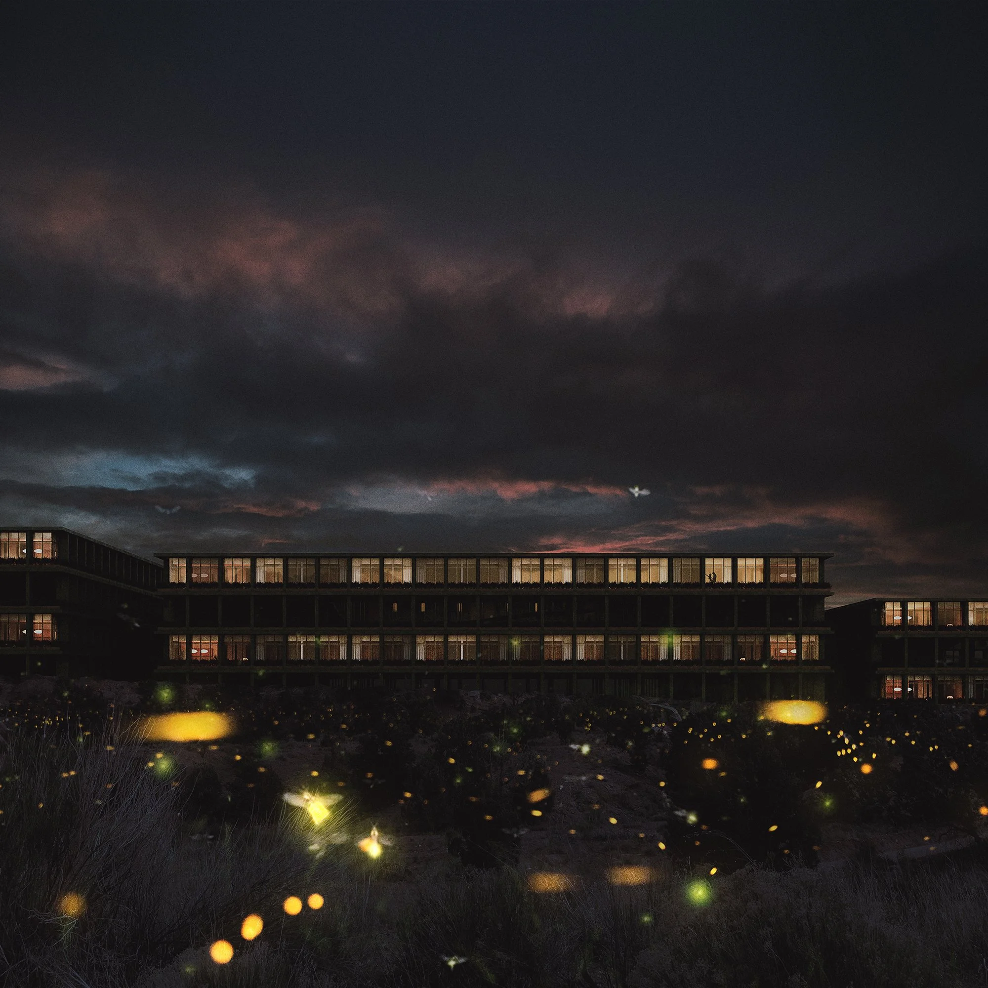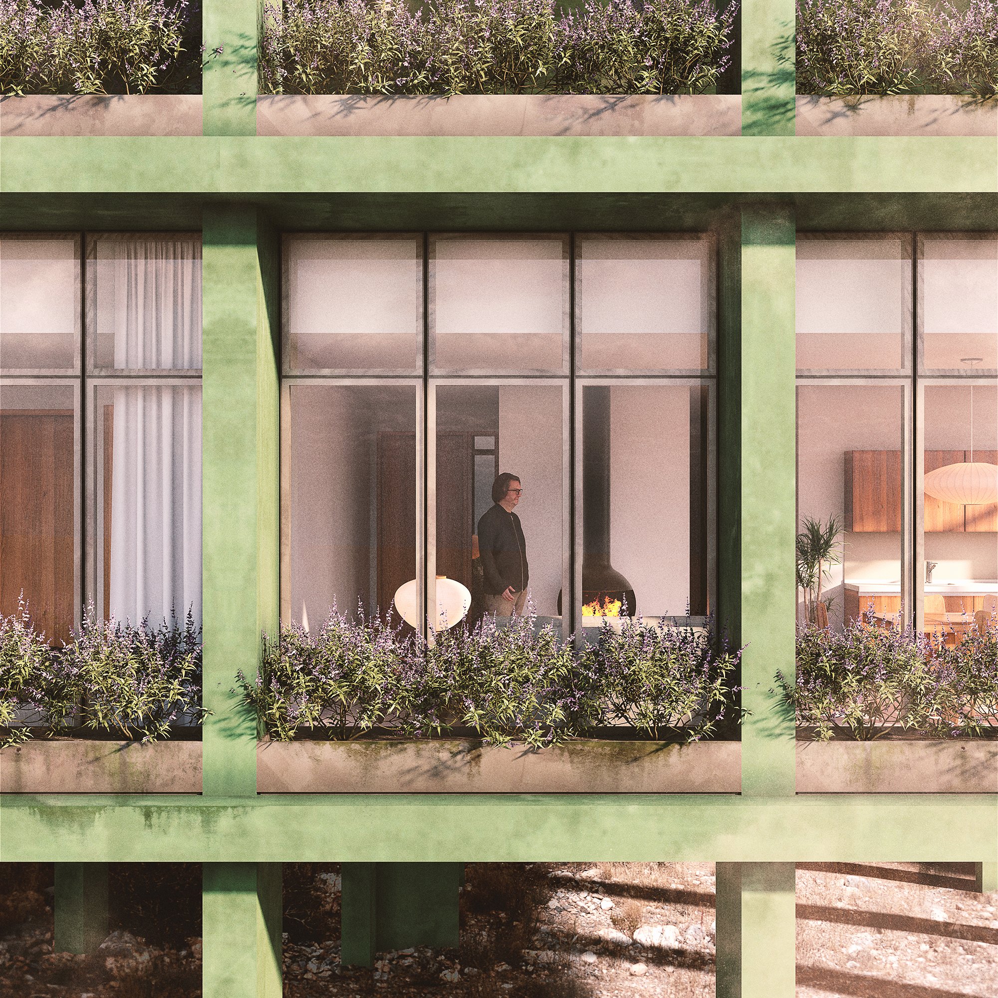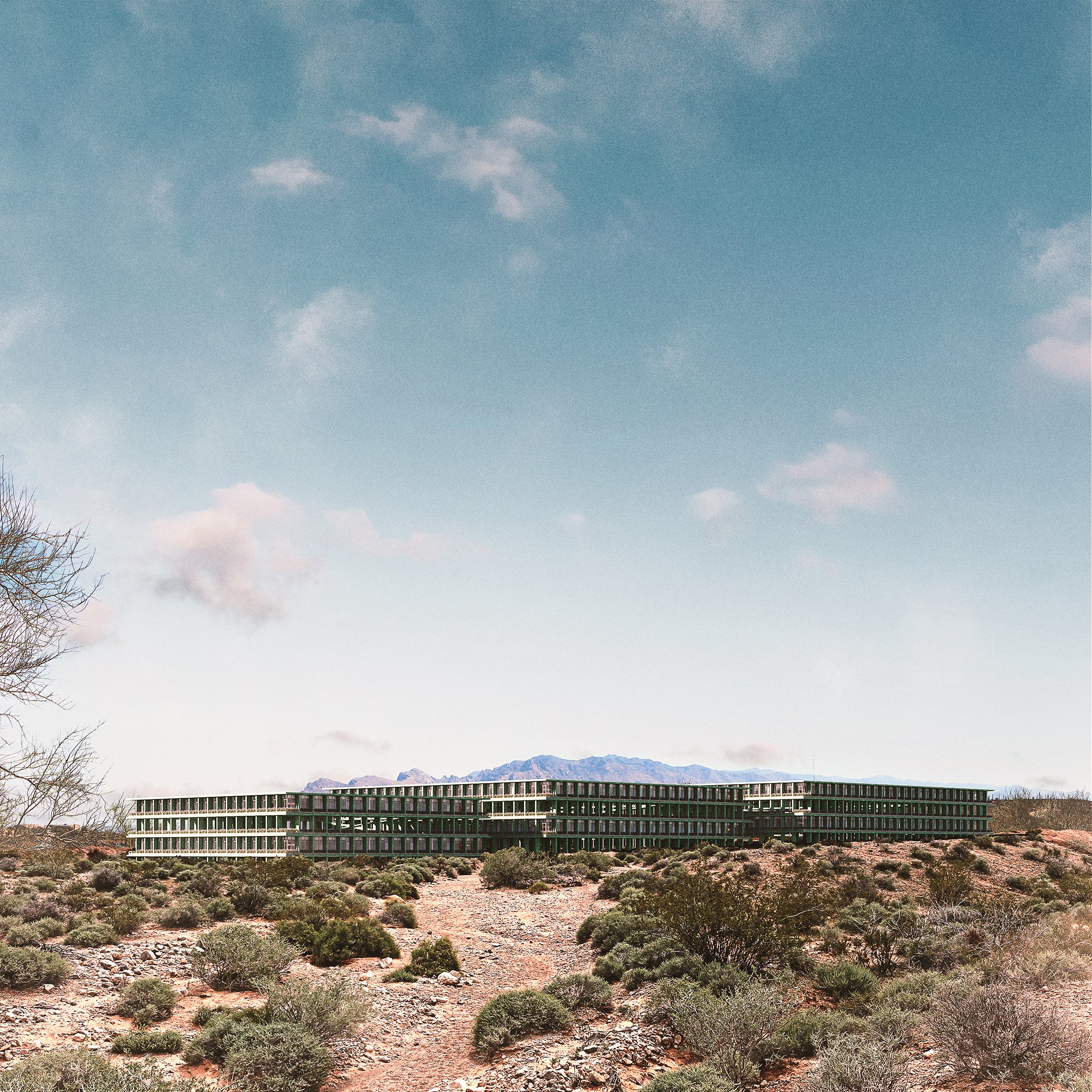 Proyecto de alta densidad que busca romper la brecha generacional al integrar jóvenes adultos y adultos mayores en un modelo de comunidad cooperativa. La arquitectura promueve la convivencia mediante espacios compartidos, patios y circulaciones abiertas que fomentan interacción y apoyo mutuo. Las estructuras de concreto en tono verde emergen como hitos en medio del paisaje desértico, aportando identidad y contraste.