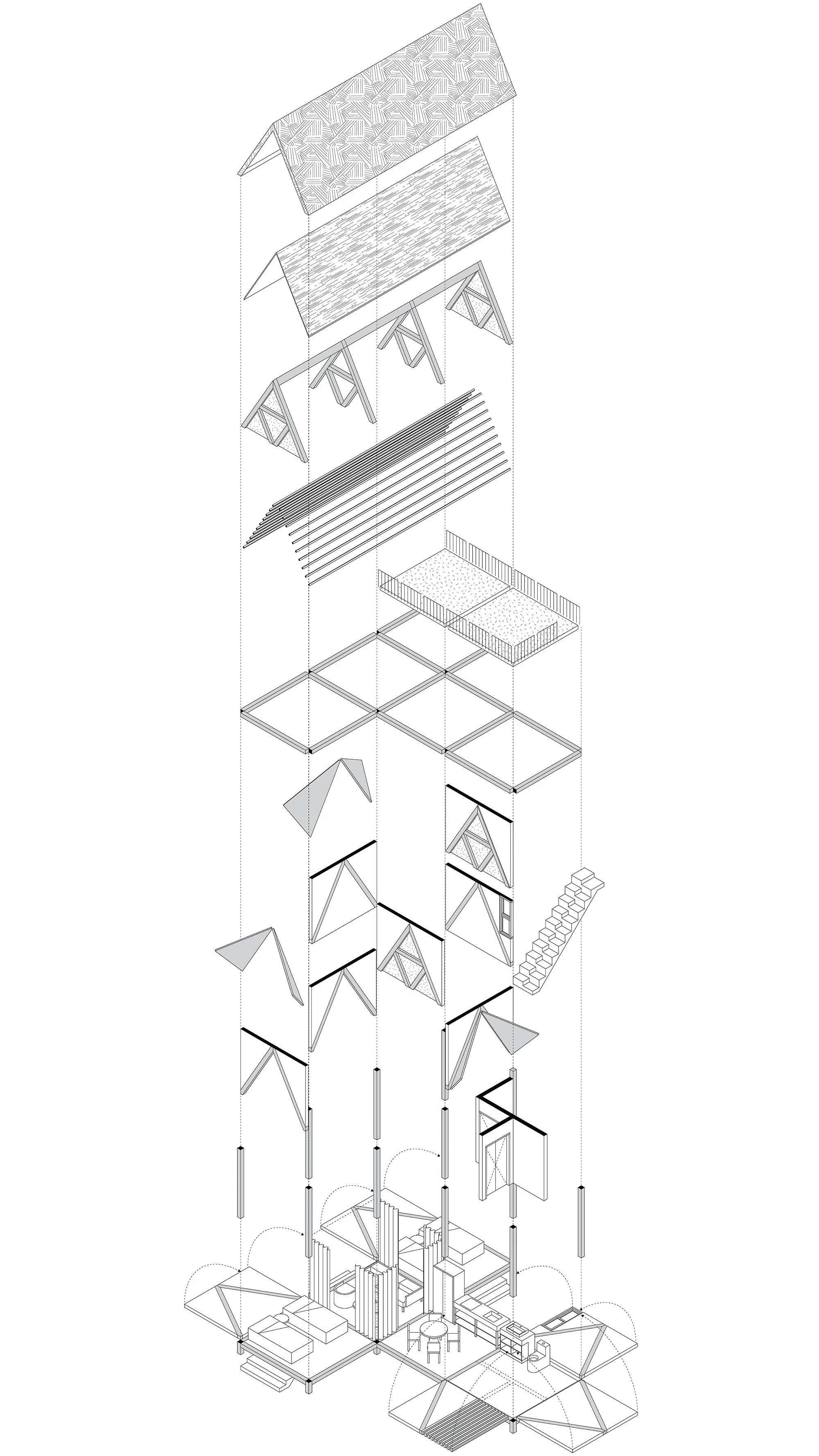 La propuesta plantea un sistema modular, simple y escalable, capaz de responder de inmediato a emergencias y transformarse en vivienda permanente, restituyendo dignidad y sentido de pertenencia. Funciona por escalas —bloque, manzana, barrio y comunidad— permitiendo crecimiento progresivo vertical y horizontal. Utiliza madera local tratada con Yakisugi, técnica que mejora durabilidad, resistencia y mantenimiento, aportando identidad atemporal. La prefabricación facilita montaje rápido y activa la economía local. Integra estrategias bioclimáticas y una geometría triangular simbólica que representa resiliencia y estabilidad, adaptándose a distintos contextos globales.